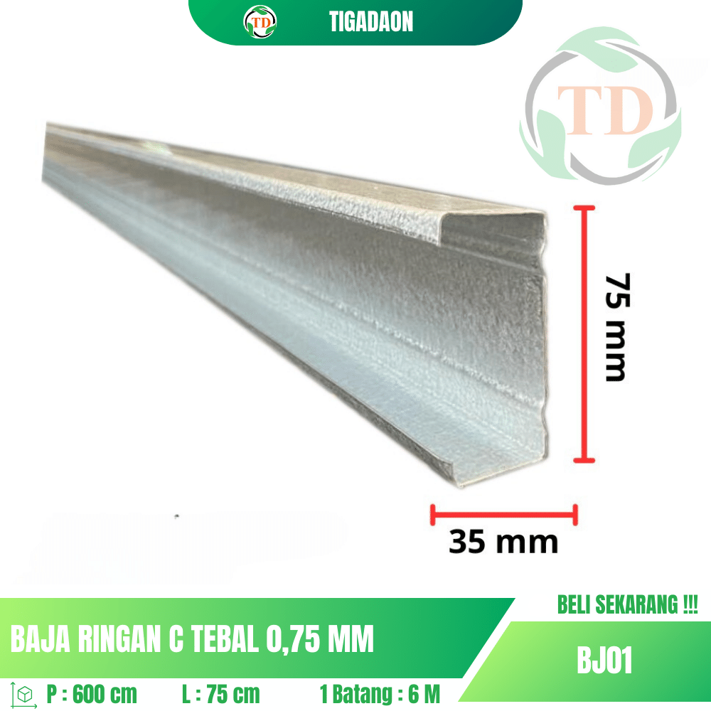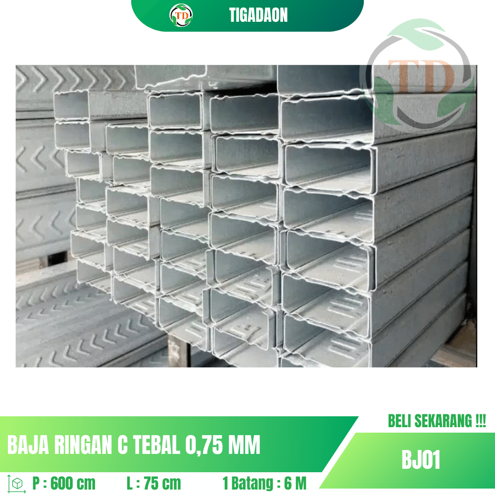 Baja Ringan C dengan ketebalan 0.75mm, panjang 1 batang sepanjang 6 meter, dan model berbentuk huruf “C” adalah salah satu produk andalan dari toko TIGADAON. Didesain dengan presisi tinggi dan menggunakan bahan berkualitas, produk ini menawarkan solusi terbaik untuk kebutuhan konstruksi Anda.