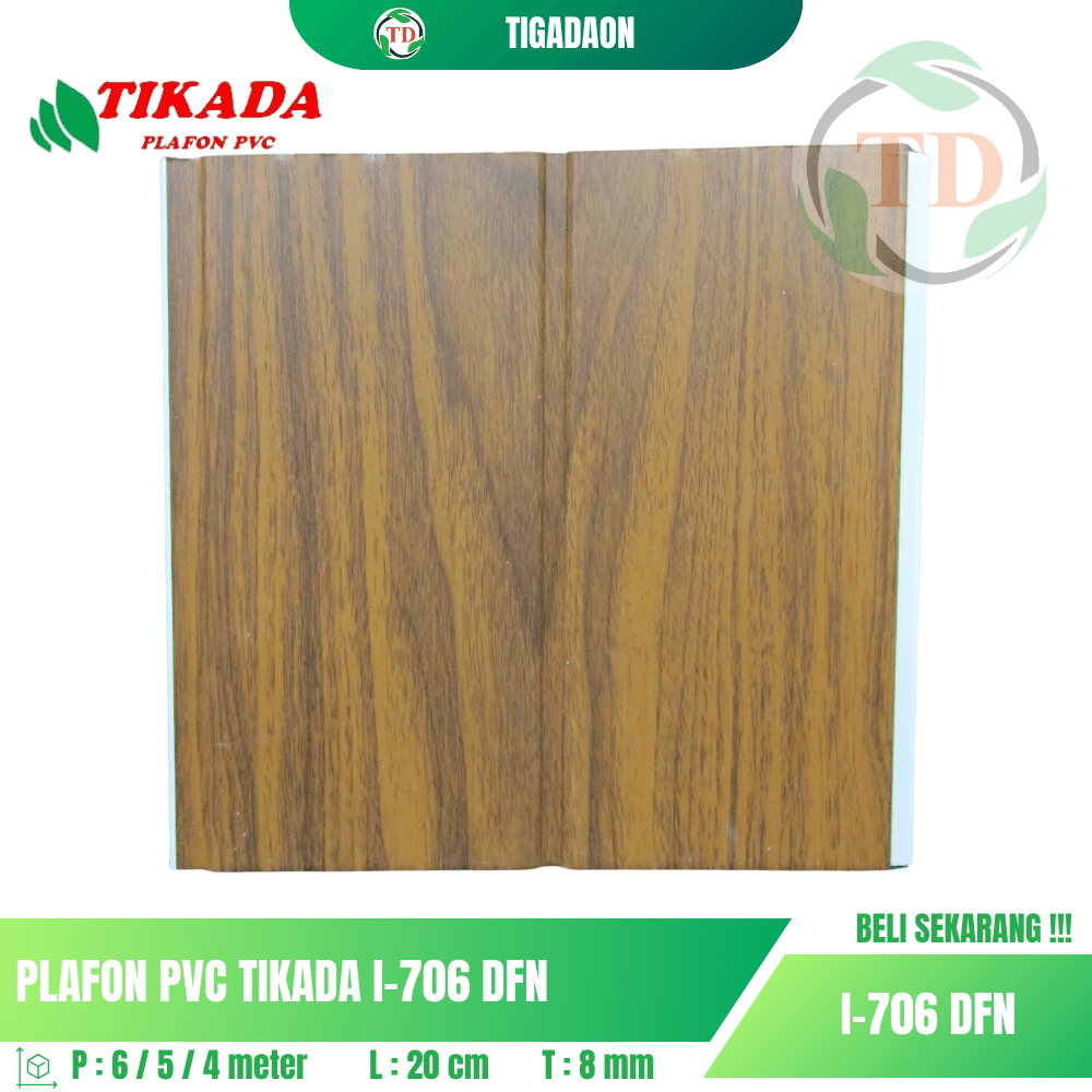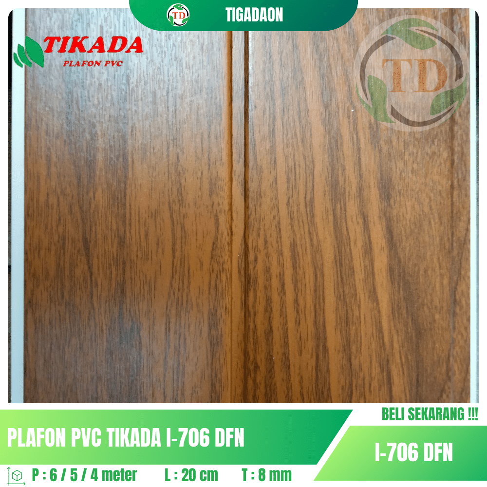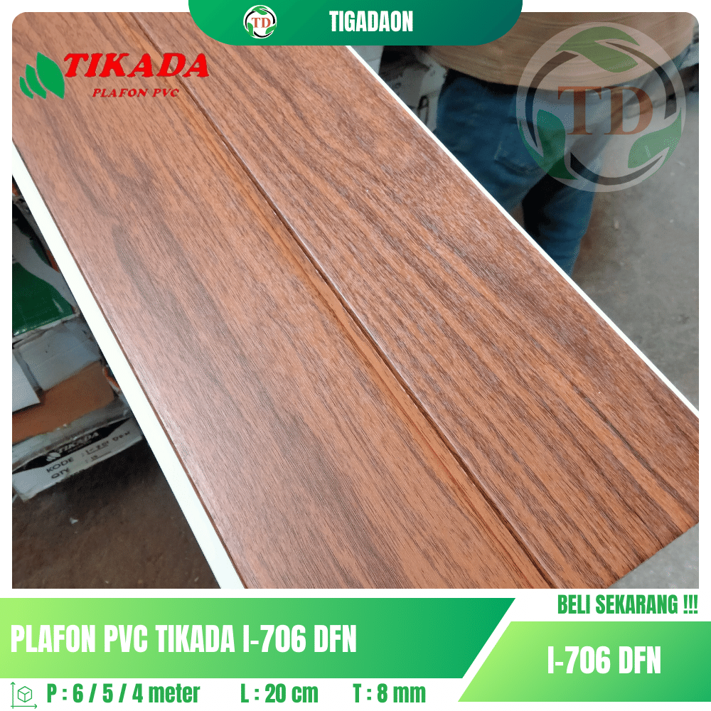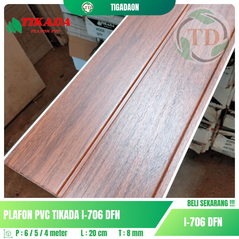 Plafon PVC TIKADA I-706 DFN Laminate corak kayu coklat dengan garis pemisah memberikan tampilan elegan dan natural pada ruangan Anda.