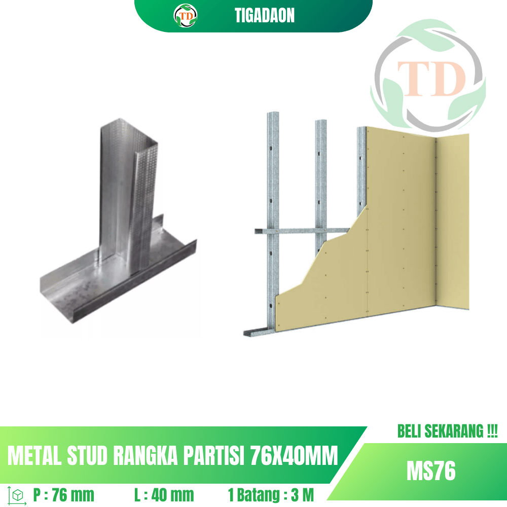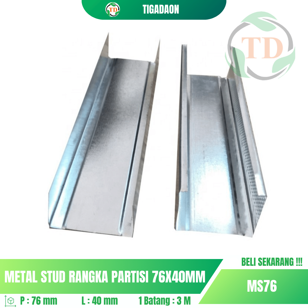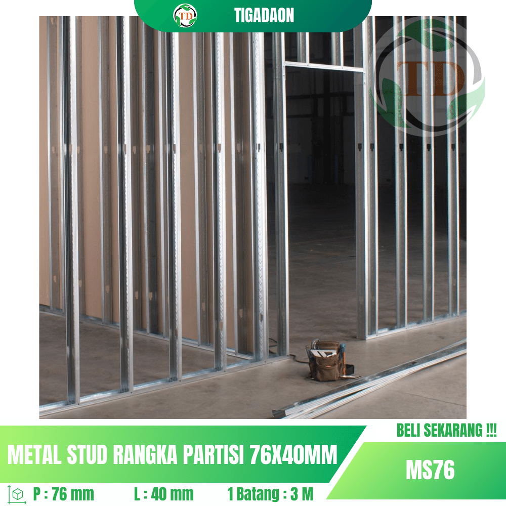 Rangka Partisi Metal Stud 76x40mm, 3 meter, tersedia di TIGADAON. Solusi andal untuk pembuatan partisi interior yang presisi.