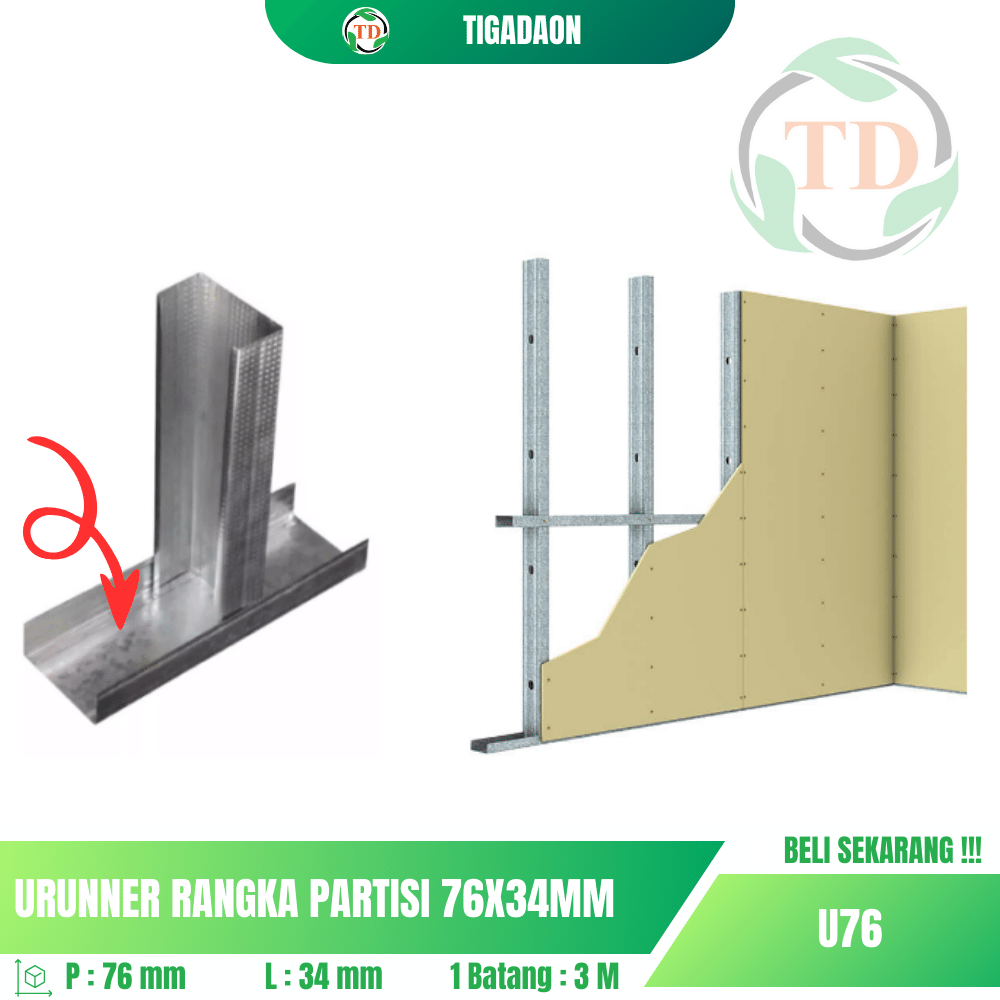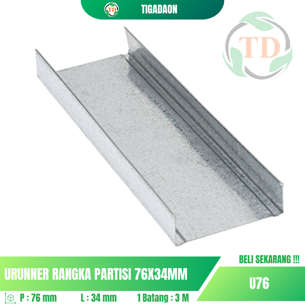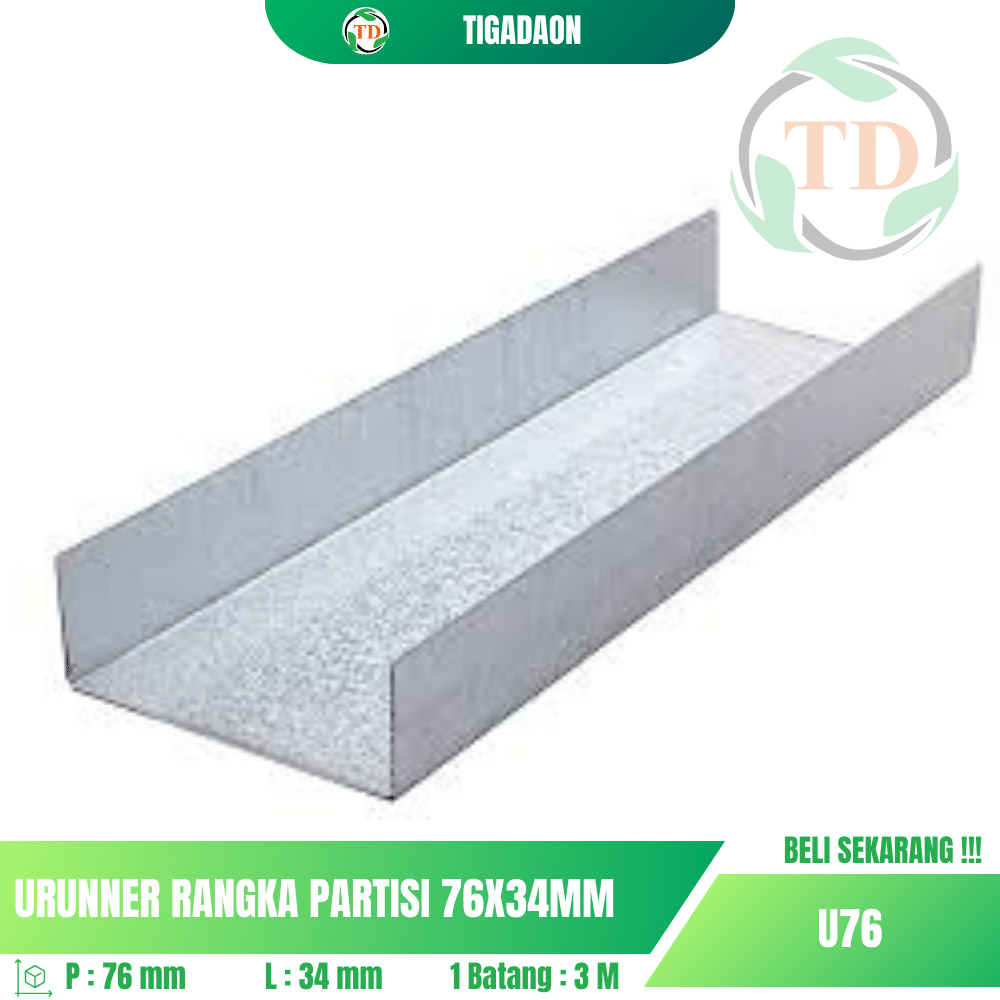 Rangka Partisi Urunner dengan dimensi 76×34 mm dan panjang 1 batang sepanjang 3 meter adalah salah satu produk andalan dari toko TIGADAON, dirancang khusus untuk memenuhi kebutuhan pembangunan partisi dalam proyek konstruksi dan renovasi.